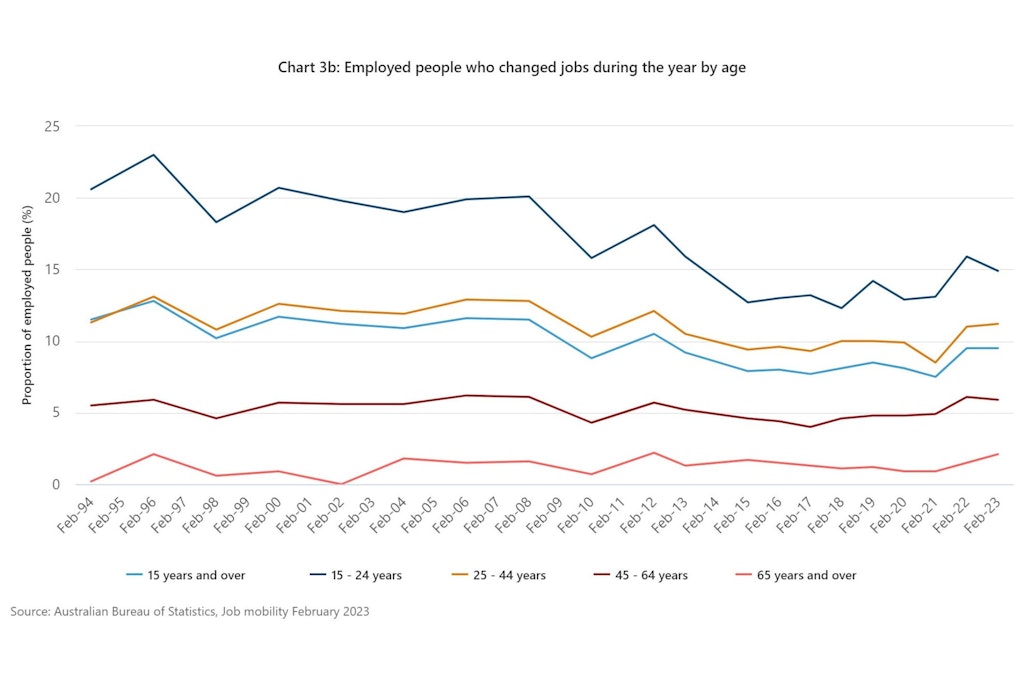 - Australia’s workforce is the most mobile it’s been in a decade with 9.5% of workers changing jobs within the 12 months prior to February 2023. In terms of numbers, 2.3 million people left or lost their jobs.