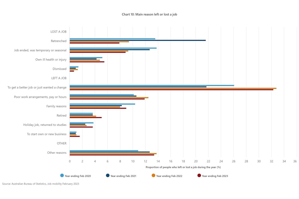 Other reasons listed for job movement include family reasons, retirement, the end of a short-term contract, injury/sickness, retrenchment and job dissatisfaction (poor work arrangements, pay or hours).