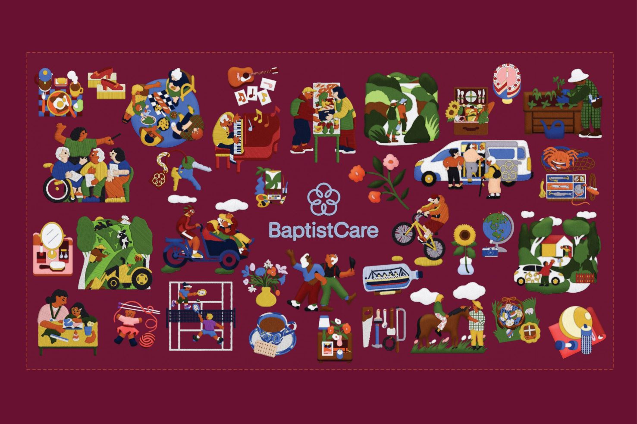 The group shares that these stories were brought to life through a blooming flower with interlinking petals. This was to honour the connections and communities of care that were the real and living centre of BaptistCare’s work.