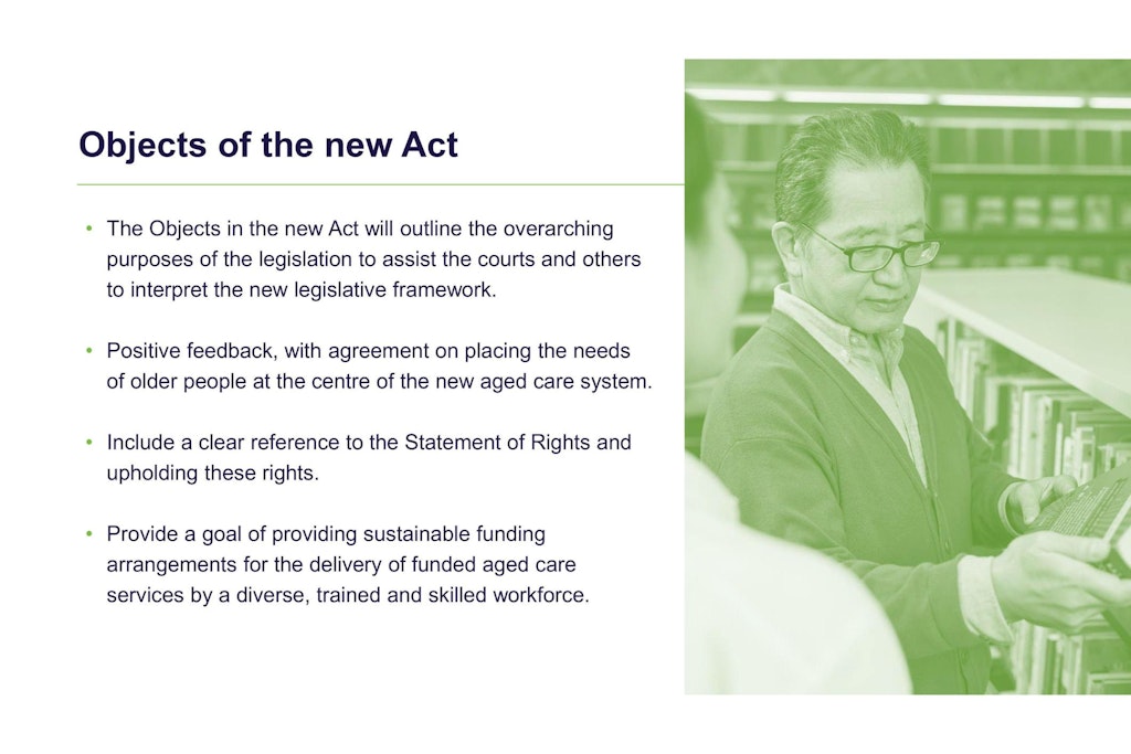 The foundations of the Aged Care Act are laid in Part 2 – Definitions and key concepts. Here, the proposed objects of the Aged Care Act explain the purpose of the legislation, while concepts and definitions provide clear and accurate reference points for providers, stakeholders, courts, etc.