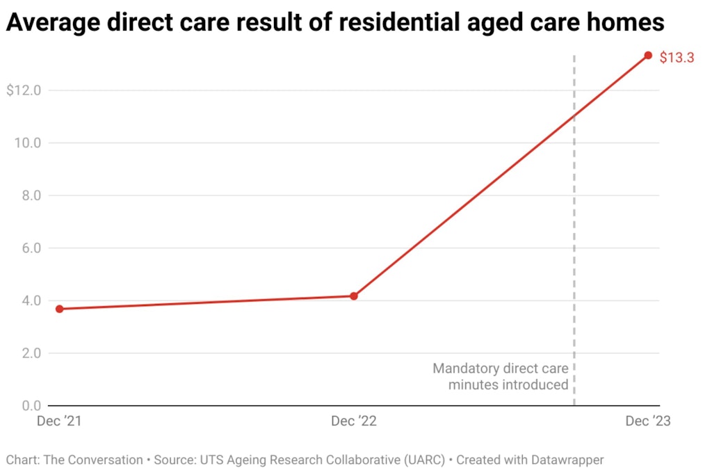 Because of the failure of some providers to meet their mandated targets to December 2023, the sector, on average, generated a significant direct care surplus of more than A$13 per resident per day. Some providers have been using the money to cross-subsidise losses they incur for their everyday living services and accommodation.