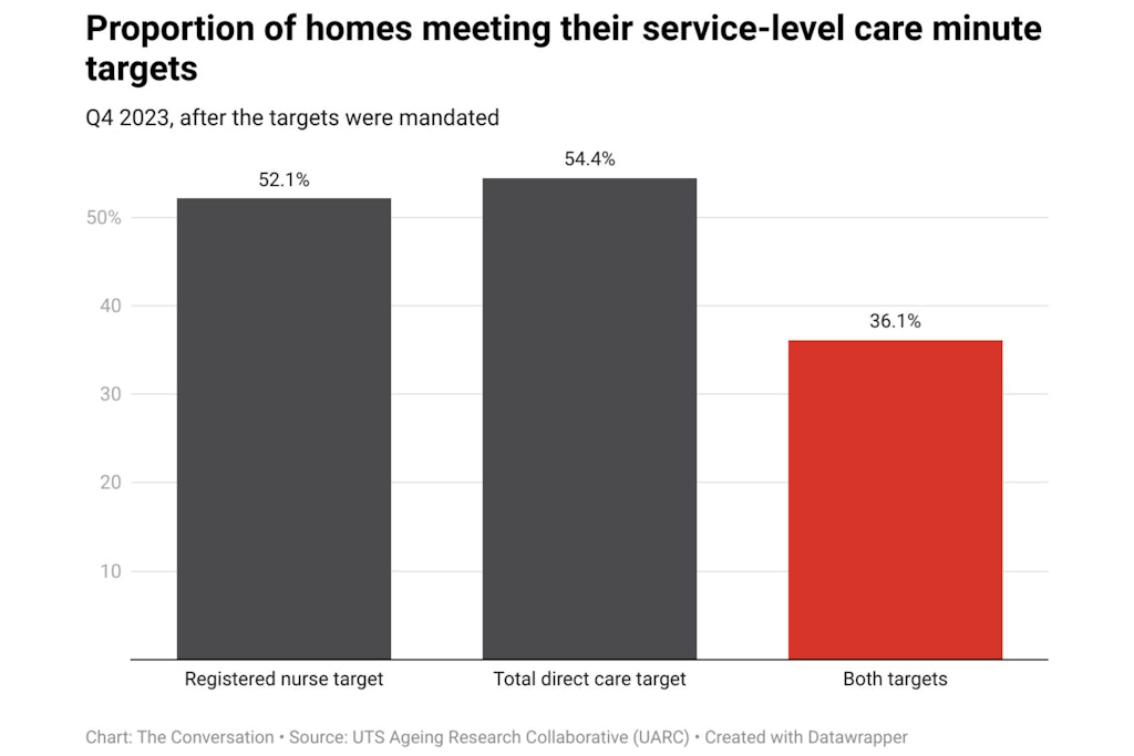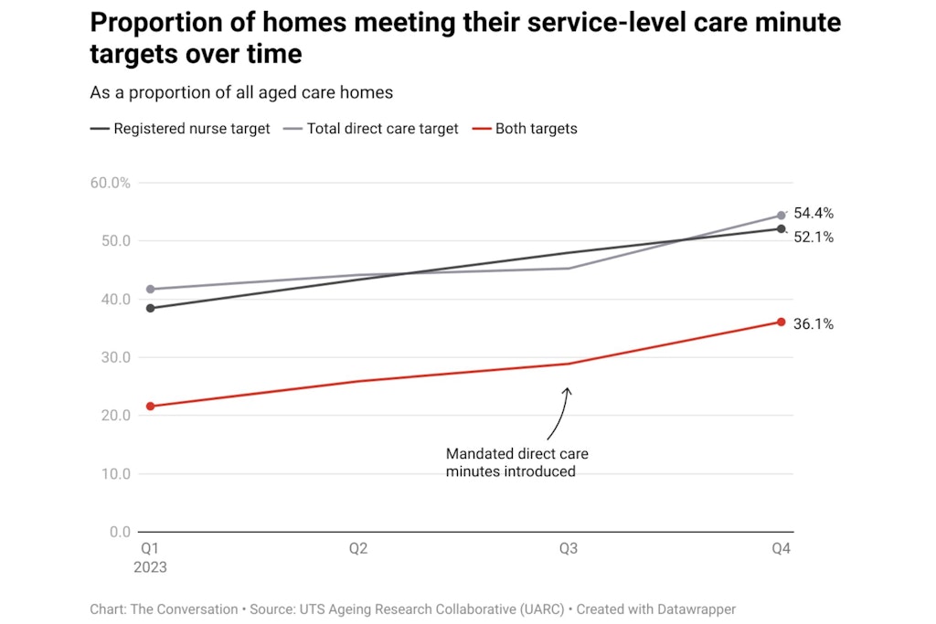 These standards became mandatory on October 1 2023. For the first three months after the targets were mandated, only half of all providers met or exceeded either of their care targets (the total direct care minutes or the registered nurse target). Only 36% met both.