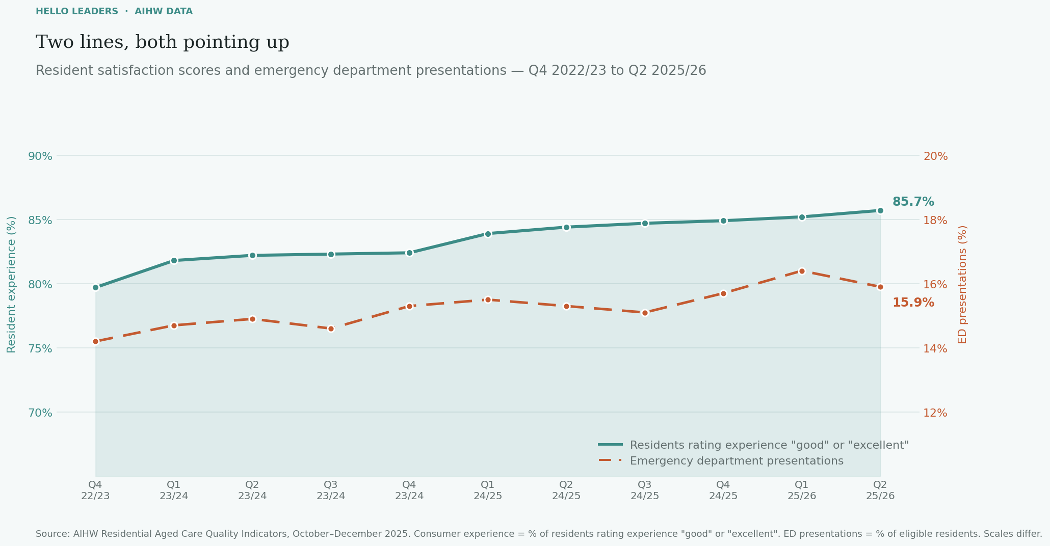 And the numbers residents are reporting about their own experience? Remarkable. 85.7% of residents rated their experience of their home as ‘good’ or ‘excellent’ — the highest figure ever recorded in this program. Quality of life ratings sit at 76.7%, also trending upward. In a sector that has endured years of public scrutiny and reputational damage, these numbers represent something meaningful.