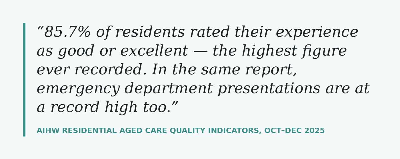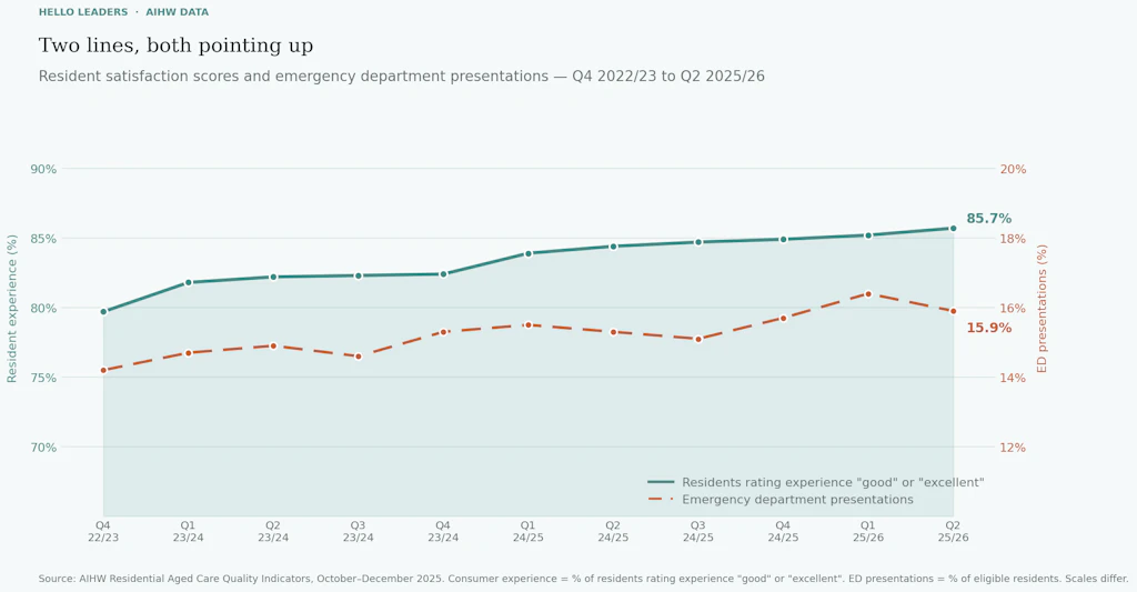 But the coexistence of record satisfaction scores and rising hospitalisation rates asks a question that the sector should be willing to sit with: are we measuring resident experience, or resident safety? And when those two things diverge, which one tells us more about the quality of care being delivered?