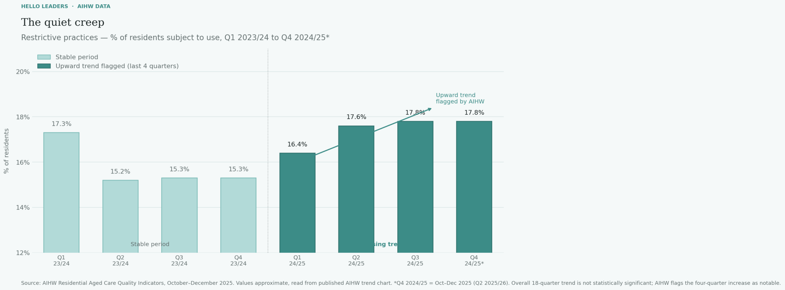 The report notes that there has been no statistically significant change in restrictive practices across the full 18-quarter trend period. But it flags — pointedly — that both restrictive practices indicators have shown a gradual increase across the most recent four quarters. The AIHW considers this notable enough to specifically call out when interpreting the data.