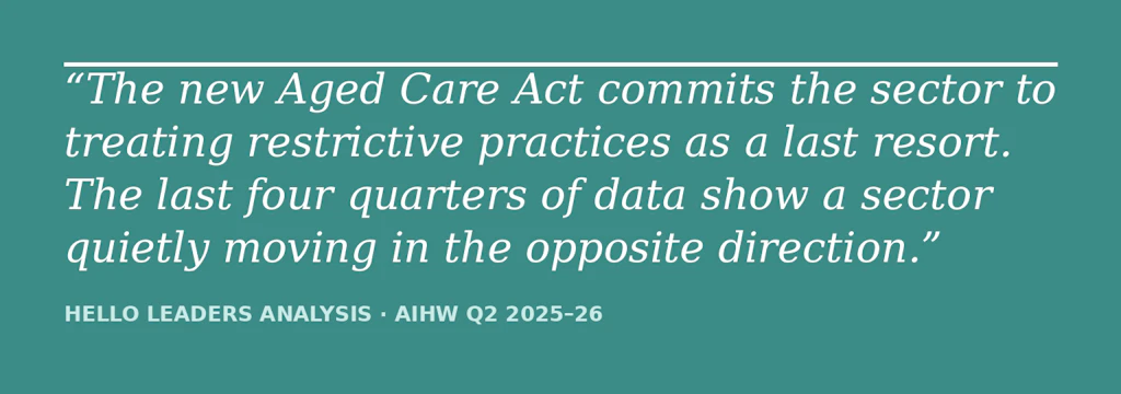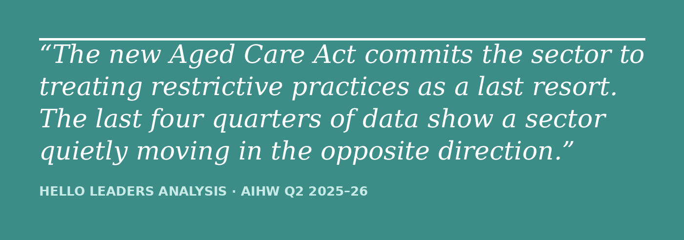 This matters because the timing is striking. The new Aged Care Act came into force on 1 November 2025 — the first month of the quarter covered by this report. One of its central commitments is a rights-based framework that treats restrictive practices as a last resort. The legislation is explicit. The expectations are clear.