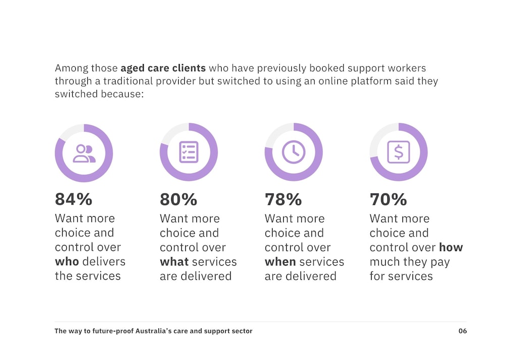 The data shows aged care and disability clients are often twice as satisfied with the services they receive through online platforms. Control over when the services are delivered, who delivers them and even the ability to cancel or change at the last minute were top priorities for clients.